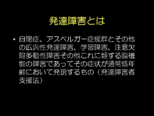 この法律ができる前までは、アスペルガーとか注意欠陥多動性障害と呼ばれる人々は法律の中では障害者としてきっちり認められていなかったのですね。最近やっとこの子どもたちが障害を持っていて支援が必要なんだということが法律の中でも謳われるようになってきました。