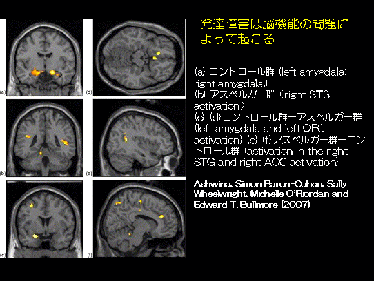 さきほどのビデオで出てきた子どもの様子を見るとですね、わがままな子どもさんに見えたかもしれませんけども、ああいうアスペルガーの人たちの脳の活動を測ってみると違いが見えるんです。