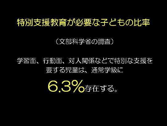 そういう子どもたちが今どのくらいいるかというと、文部科学省はですね、通常の学級の中に発達障害の特性をもつ子どもたちが6.3%いるという結果を出しています。