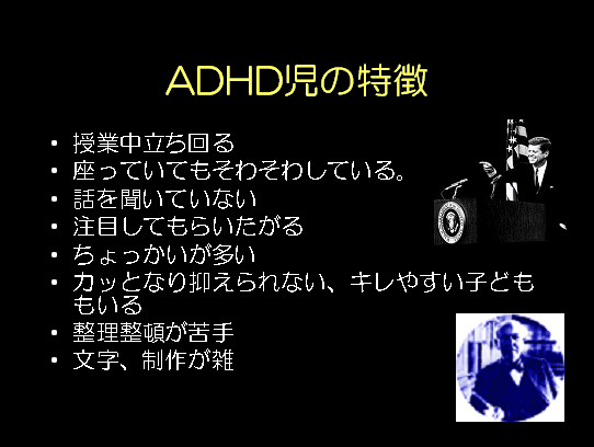 結構アニメの主役はADHDの人が多いですね。クレヨンしんちゃんなんかもその範疇にはいります。結構有名人にも多いですね。ここに出てきてるケネディとかエジソンといった人たちもADHDだと言われています。野球で有名な新庄とか、長嶋茂雄とかもそういうタイプではないですかね。長嶋茂雄が一茂を球場に忘れて行ったというエピソードを聞くと、なるほどな、と思います。