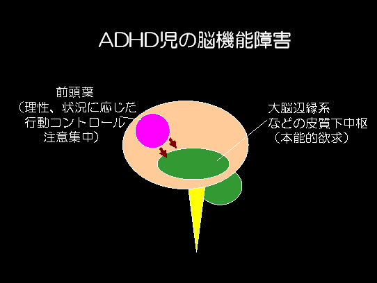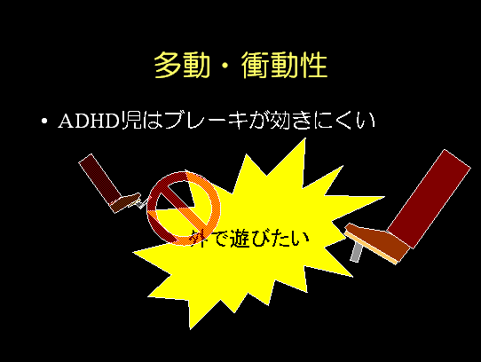 でもADHDのお子さん方はですね、前頭葉の方の働きがうまくいかないことがあってですね、外で遊びたいというアクセルが踏まれたときブレーキがうまくかからないことがあるんですね。だから出ちゃダメだとわかっていても飛び出してしまう。たたいちゃダメだと分かっていても自分を止められないということが起こってしまいます。
