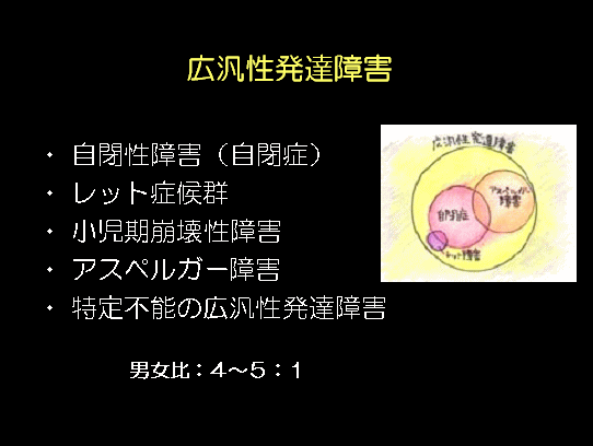 次は「広範性発達障害」です。この中で、後で「自閉症」と「アスペルガー症候群」の説明をいたします。自閉症は対人関係などに問題があるお子さんが多いです。自閉症は広範性発達障害に含まれる障害です。広範性発達障害は、自閉症と関連する障害で、広義の自閉症だと思ってください。