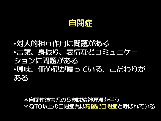 自閉症の子どもの5割は精神遅滞を伴います。IQ70以上のお子さんは高機能自閉症と呼ばれていまして、通常学級の中にいることが多いですね。それで社会の中で福祉的な支援を受けられない方が多いです。