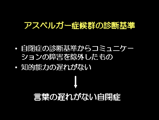 アスペルガー障害は自閉症からコミュニケーション障害を除外し、知的能力の遅れがないものをいいます。言葉の遅れがない障害をアスペルガーだと思ってください。