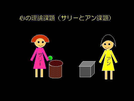 この課題というのは、「サリーが籠の中にボールを入れました。そしてサリーは部屋の外に出て行きました。そのすきにアンはこっそりとボールを籠から箱の中にボールを移しました。そして部屋の外に行きました。サリーが戻ってきました。ボールで遊ぼうと思っています。どちらを探すでしょう。というものです。