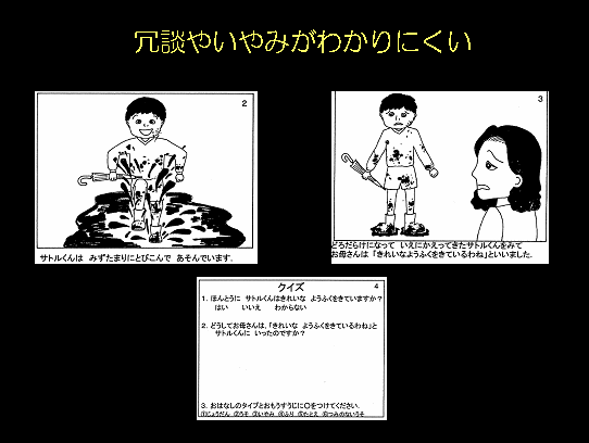 どうしてお母さんは「きれいな服を着ているか?」と言ったかを聞くと、「この泥が模様に見えたんじゃないか」と答える人もいます。ときどき正常の知能のアスペルガーの子もそう答えます。お母さんがきれいだと言ってるから、きれいだと思ってると捉え、「嫌味」とわからないことが多いです。