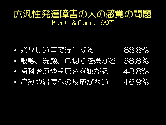 広範性発達障害の人たちは感覚に問題があって、騒々しい音で混乱したり、散髪、洗顔、爪切りを嫌がるという人が70パーセントもいます。歯医者さんでパニックになってしまうお子さんもいらっしゃいます。脳の構造が違うため、周囲の音に敏感になってしまい苦しみを感じてしまうお子さんもいます。