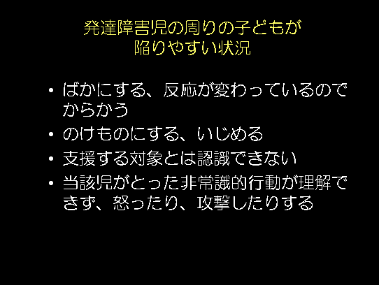 あと学校での対応も変わってきておりますので、そういうところからも始まっています。それに順じて大人たちも子どもたちに対して対応を考えていく必要があります。「特別支援教育」というのは平成19年(2007年)から始まっています。