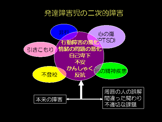 早い対応、適切な対応をすることによって二次障害、三次障害を防ぐことができます。ですので、早めに発達の問題に気づいてやって、適切な対応を周りがやっていくことが大切となってきます。
