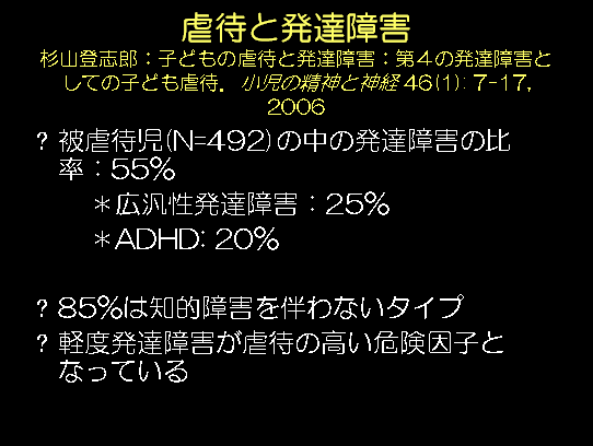 「虐待」との関係も指摘されてまして、虐待が見られる子どもの55%が発達障害だというデータが出ています。