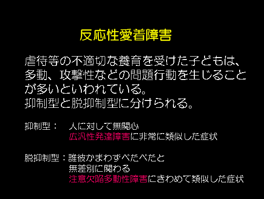 次は、発達障害と隣り合わせの問題も話したいと思います。「反応性愛着障害」という問題です。