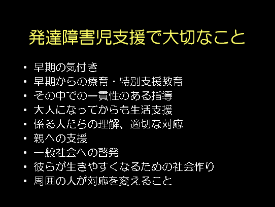 発達障害を、一般の方たちが理解していく、早期に気付いて適切な支援をしていくことが大事です。