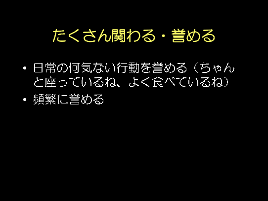 問題行動が起こったときに叱るという考えよりもですね、正しい行動ができたら褒めると考えることが必要ですね。