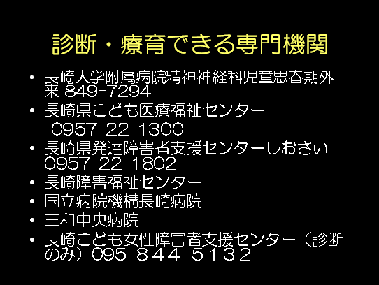医療での対応ですが、ADHDのお子さんに対して最近良いお薬ができてまして、長崎大学のほうで小澤先生に診てもらえばいただけると思います。